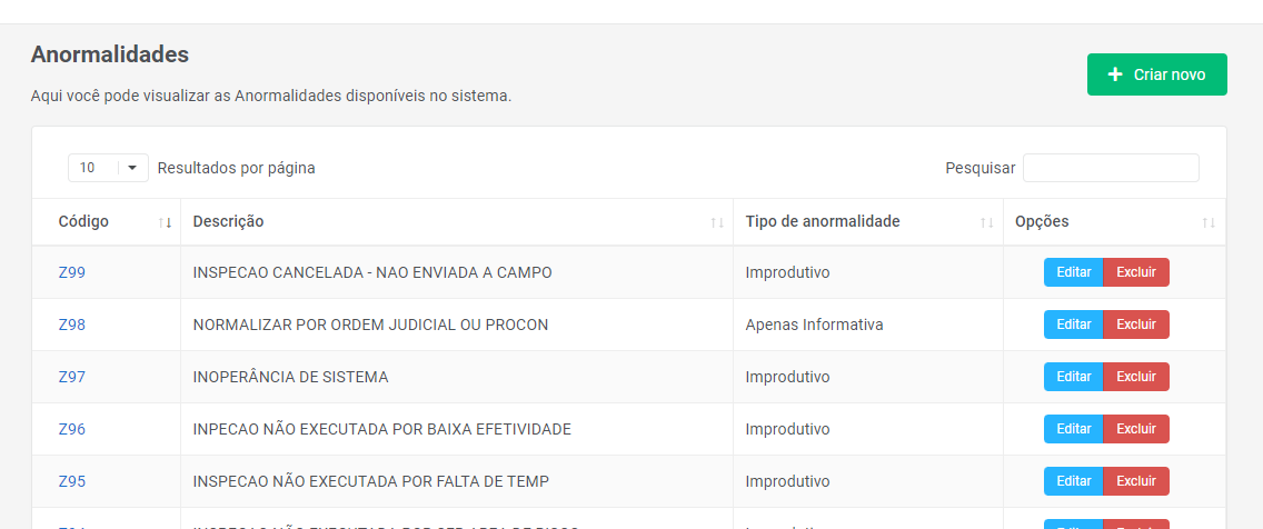 As anormalidades são utilizadas para informar qual anormalidade ocorreu na execução da O.S, além de informar o tipo de faturamento das O.S. (Produtiva ou Improdutiva).