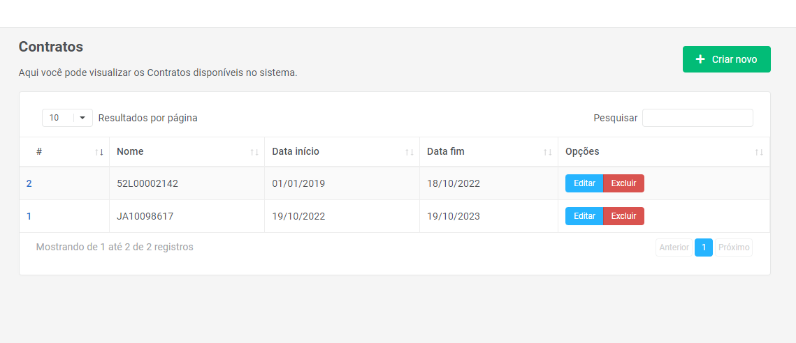 Você pode utilizar o botão Excluir presente em cada registro, caso você deseja excluir um Contrato