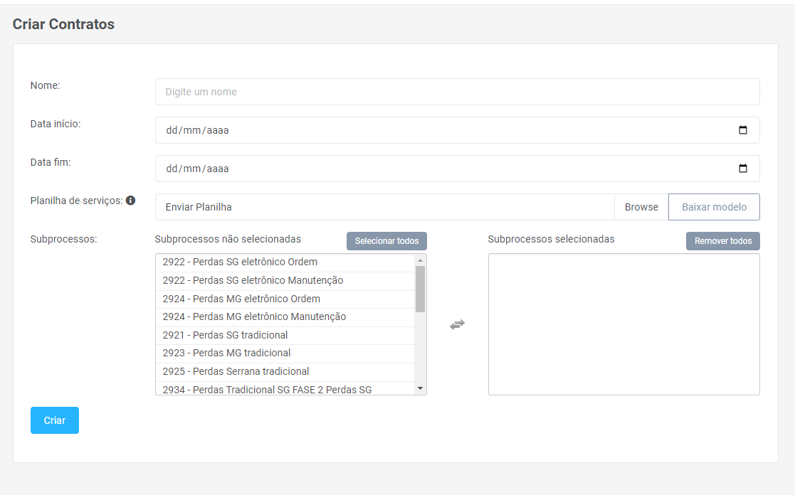 - Subprocessos: campo opcional para associar subprocessos ao contrato.