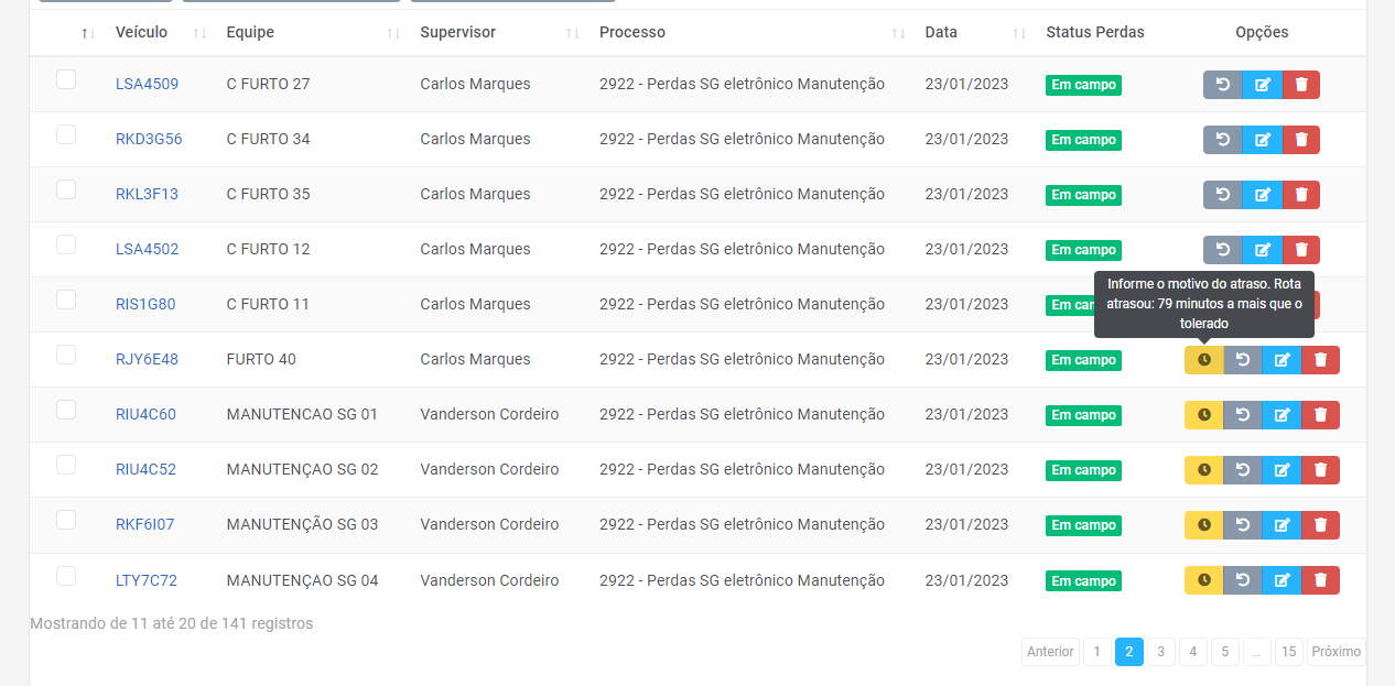 Identifique a rota que está atrasada. Essa informação pode ser encontrada por meio do ícone correspondente na coluna de opções da tabela de Rotas.