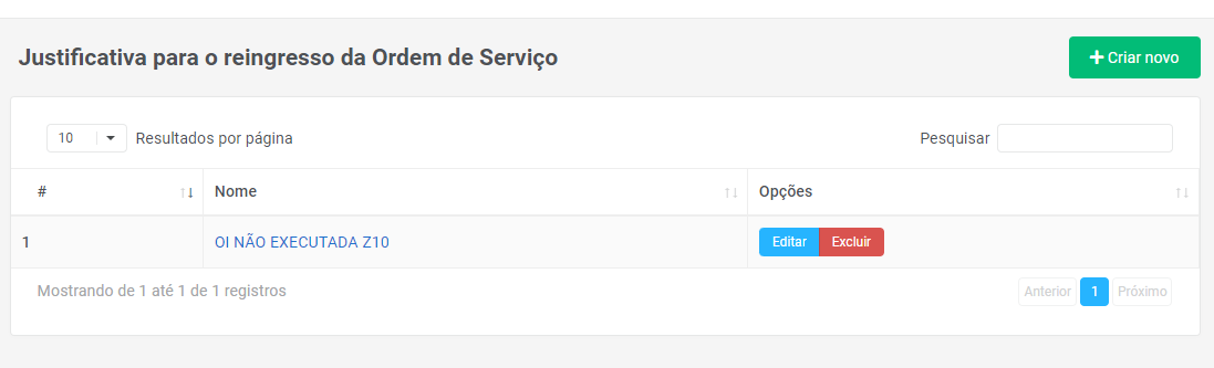 -> "Justificativa para o reingresso da Ordem de Serviço" e clicar em "Criar Novo"