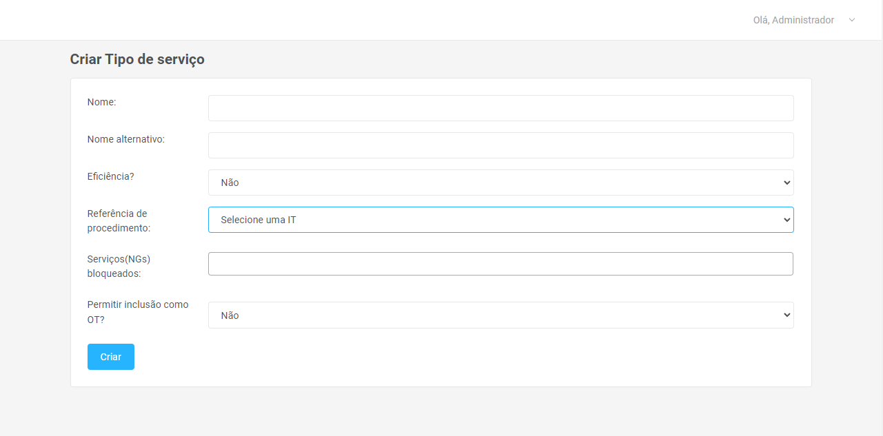 - Nome: campo obrigatório para inserir o nome do novo tipo de serviço.