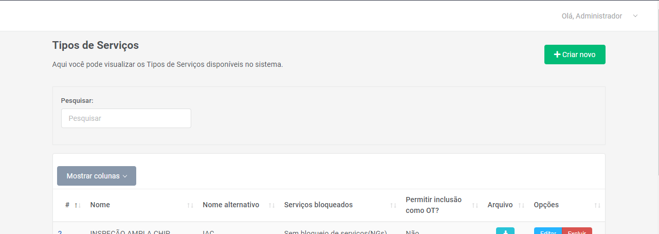 Aqui você encontra todas as funcionalidades do módulo de Tipos de Serviço