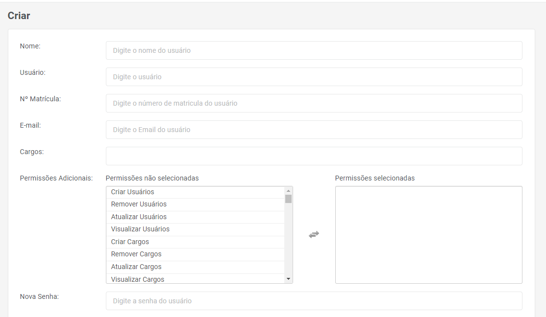 - Permissões Adicionais: Permissões adicionais ao Usuário além das permissões vinculas ao Cargo