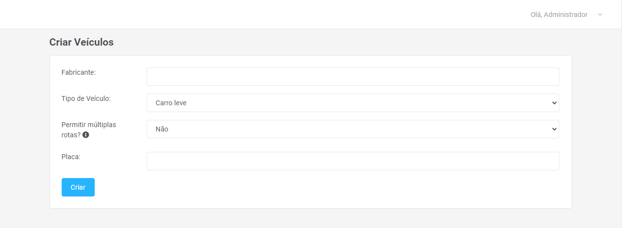 Ao acessar o formulário de criação de veículos, você encontrará os seguintes campos: